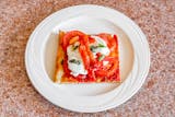 Thin crust pie topped with sliced tomatoes, fresh mozzarella, roasted peppers, fresh garlic, basil & EVOO.